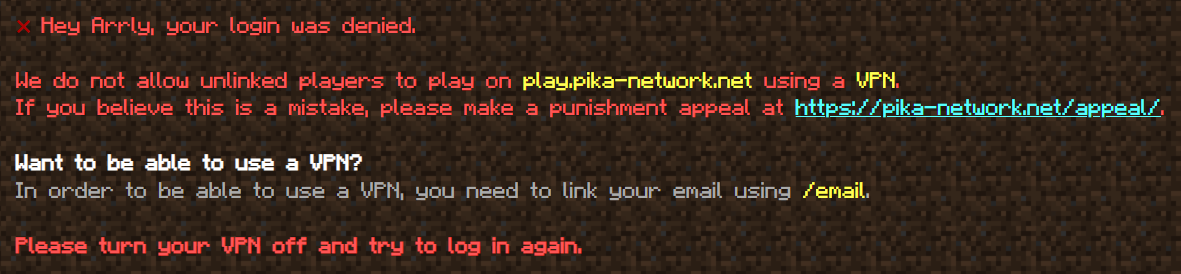 Being blocked from joining by our anti-VPN system is primarily caused by using a VPN. If you are using one, turn it off and rejoin. If you are being blocked while you are not using a VPN, make an appeal HERE and we will solve the problem for you as soon as possible.