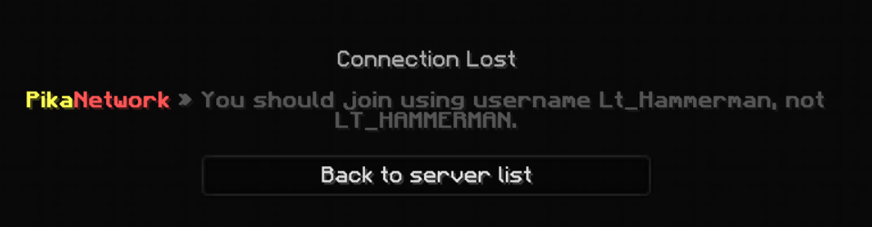 If you are asked to join with a differently capitalized username, there are two reasons why this can be the case. The first is that someone may have already registered that username on our network. In that case, use a different username when joining the server. If you registered the username on PikaNetwork, change the capitalization of your username to what is stated and you will be able to join.